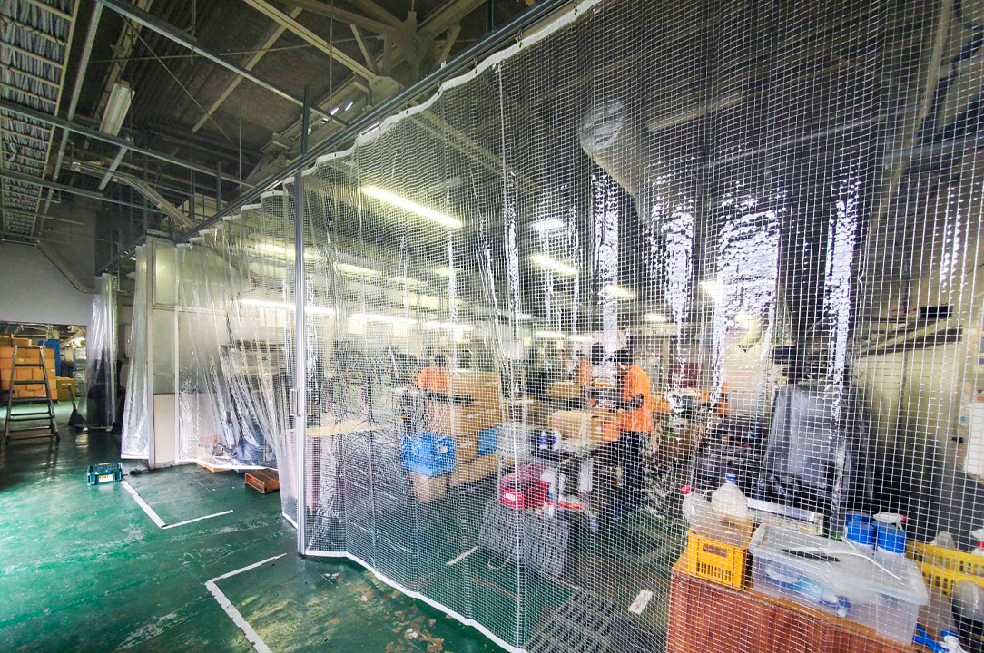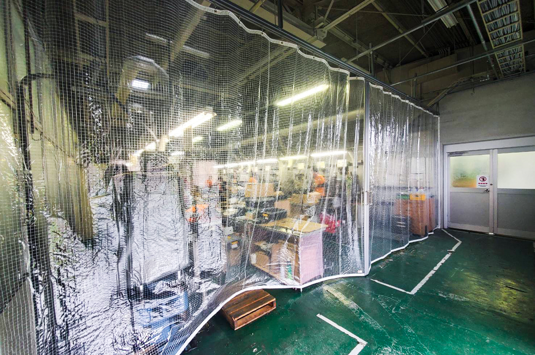干渉する高さより下へお客様の方で下地工事をして頂き、取手付のビニールカーテンを設置しました。